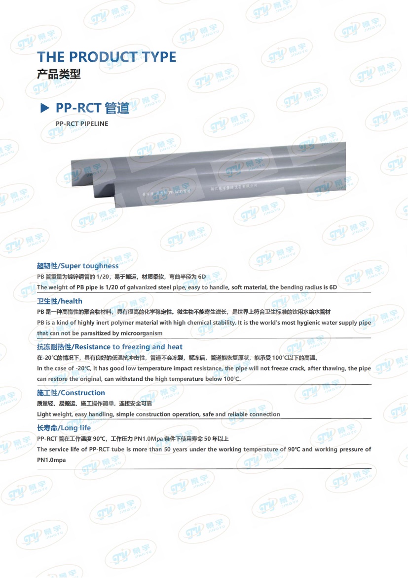 環(huán)保性:PP-RCT是結(jié)晶型改善的PPR管,無毒無害且不滋生細菌,適用于日常生活冷熱水管道系統(tǒng),及給水系統(tǒng)。